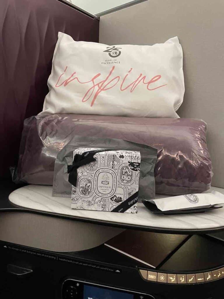 You will be provided Diptyque amenity kits, pajamas from the White Company (complete with slippers), and a menu for the flight.